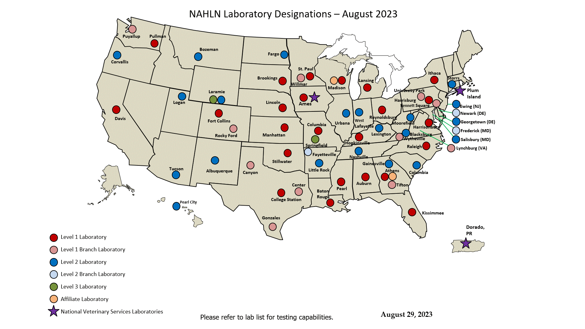View information on current NAHLN laboratories by State, designation, or disease testing. For a list of all NAHLN labs, visit All Approved Labs.